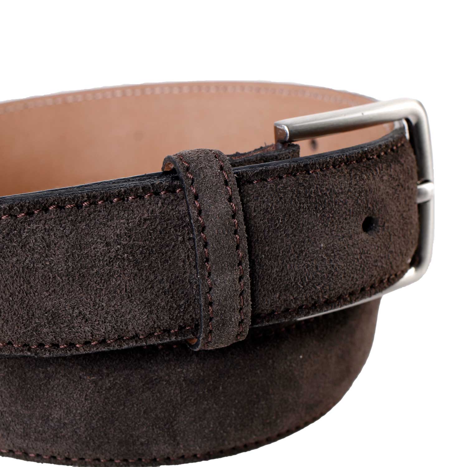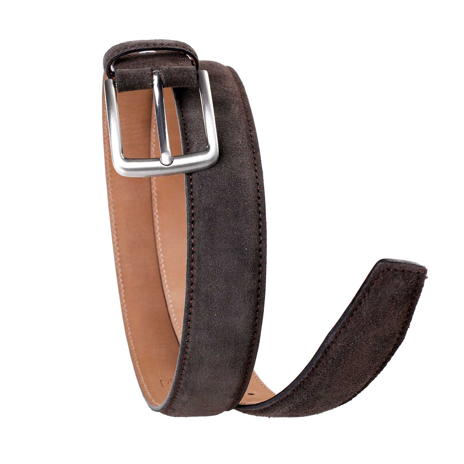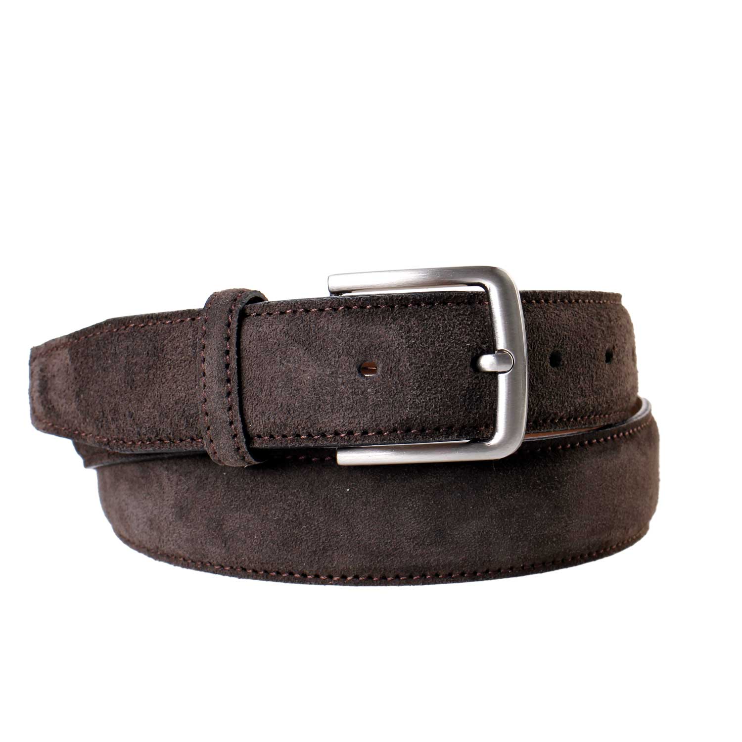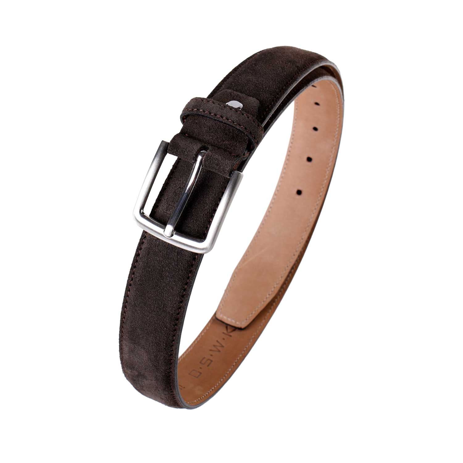 Smart og casual mørkebrunt nubuck bælte, med sølvspænde monteret med skrue. Bæltet er lavet på Fyn i Danmark. Husk en god ruskindsbørste til at vedligeholde bæltet med.